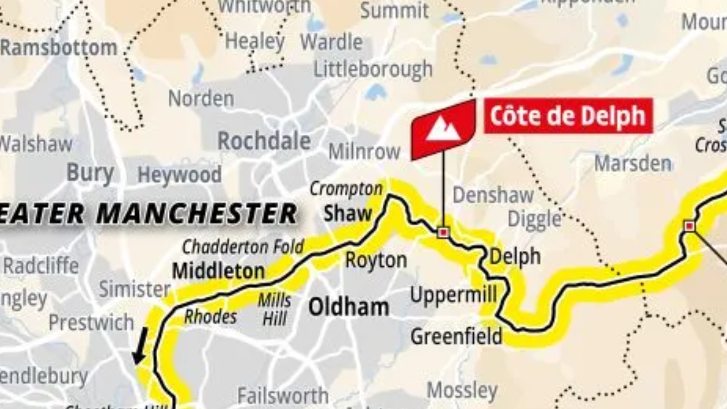 Entering Saddleworth along the A635 into Greenfield, riders will then head through Upper ill to Delph, where they will take on Grains Bar, a 2.1 kilometre ascent at 6.3 per cent.